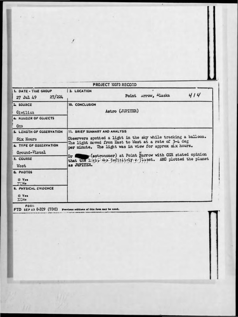 On July 27, 1949, personnel at a weather station in Point Barrow, Alaska, observed an unidentified light in the sky while engaged in tracking a weather balloon. The object was tracked for approximately six hours, during which time it maintained a level flight path from East to West at an estimated speed of 3 to 4 degrees per minute. The observers utilized a 20-power theodolite to monitor the object, which was estimated to be at an altitude between 50,000 and 60,000 feet. The incident was formally recorded as Incident 414 under Project 10073. Following the report, an astronomer named Dr. Sinley, who was present at Point Barrow and affiliated with the Office of Naval Research (ONR), provided an expert opinion that the light was definitely a planet, suggesting it was likely Venus. The Air Materiel Command (AMC) later reviewed the data and plotted the object as Jupiter. The documentation includes internal military correspondence requesting a detailed report from the witnesses and the original incoming message regarding the sighting. The report confirms that no physical evidence or photographs were obtained during the observation.