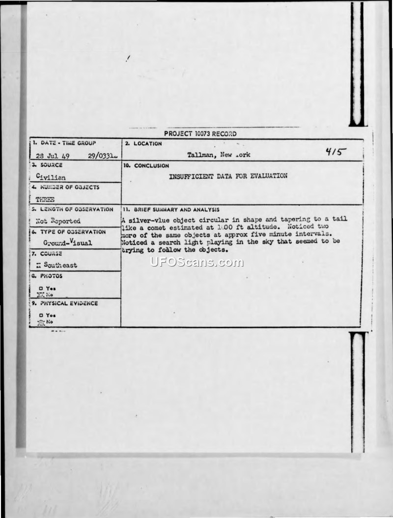 A civilian reported three silver-blue, comet-shaped objects over Tallman, New York, on July 28, 1949. The military investigation concluded there was insufficient data to evaluate the sighting.