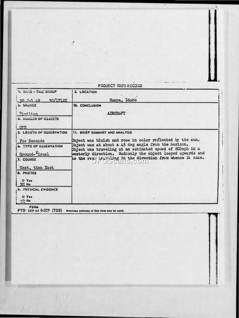 Project 10073 Record: Sighting Report - Nampa, Idaho, 30 July 1949