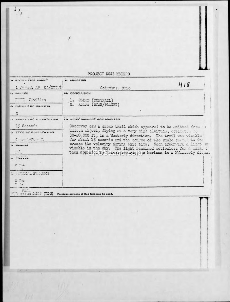 Witnesses at Port Columbus Airport reported a high-altitude smoke trail and a bright light on August 1, 1949. Official investigators concluded the phenomenon was likely a combination of a smoke trail and an astronomical body such as a planet.
