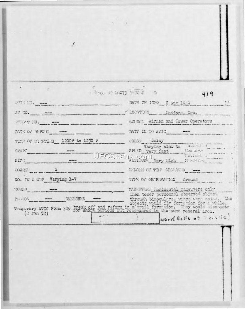 Report of Sighting of 'Flying Discs' — Medford, Oregon, 8 August 1949