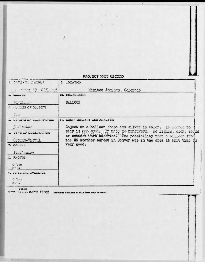 The object was observed by a civilian witness near Manitou Springs, Colorado. The investigation concluded the object was likely a weather balloon, given the lack of propulsion or maneuvers and the frequency of weather balloon launches in the area.