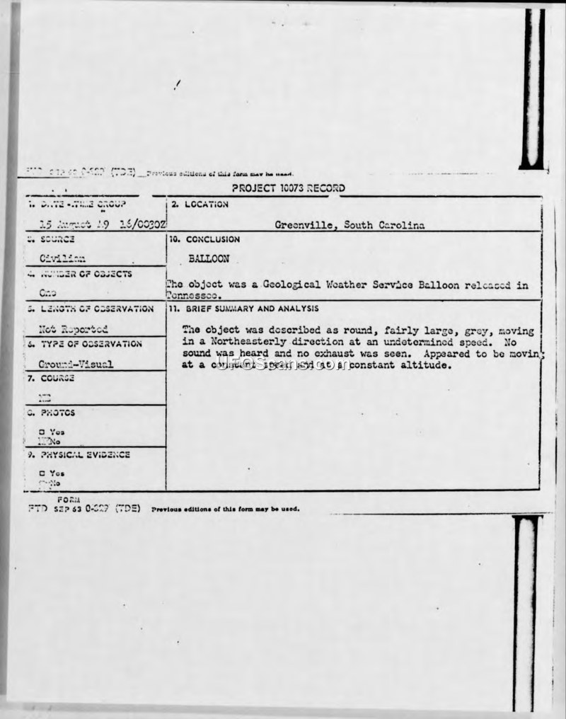 Project 10073 Record — Greenville, South Carolina, 15 August 1949