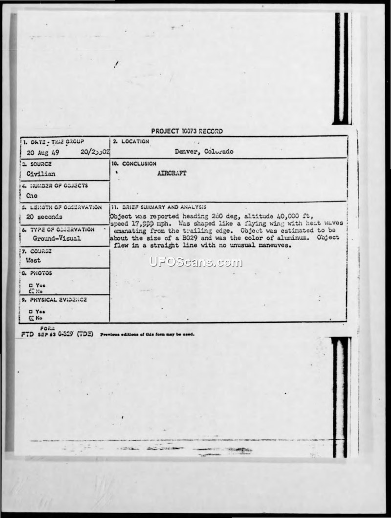 Sighting of Unconventional Aircraft at Denver, Colorado, on 20 August 1949
