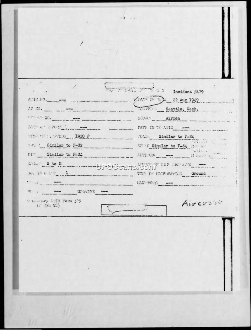 Incident #429 Sighting Report — Seattle, Washington, 22 August 1949