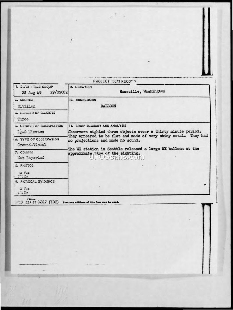 An investigation into a 1949 UFO sighting in Hansville, Washington, concluded that the objects were likely a weather balloon released from Seattle. The report documents witness testimony and meteorological data collected by the Air Force.