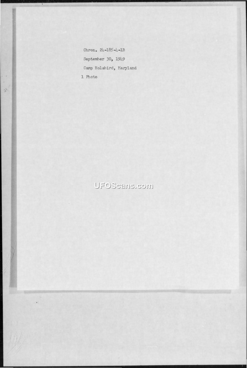 This document consists of a brief administrative record and a single photograph related to an event at Camp Holabird, Maryland. The administrative cover sheet is dated September 30, 1949, and references file number 24-185-4-1B. The primary content is a photograph depicting a scene at Camp Holabird, which includes a technical annotation on the back. The technical details provided for the photograph indicate it was taken on October 3, 1949, at 0930 hours. The camera used was a Speed Graphic, utilizing Super XX film. The camera settings were recorded as 1/100, f 11, at infinity. The photograph itself shows a landscape view of the installation, with an arrow pointing toward a specific area in the sky or distance, though the object itself is not explicitly described in the text. The document serves as a formal record of the photographic evidence collected in relation to the reference number provided.
