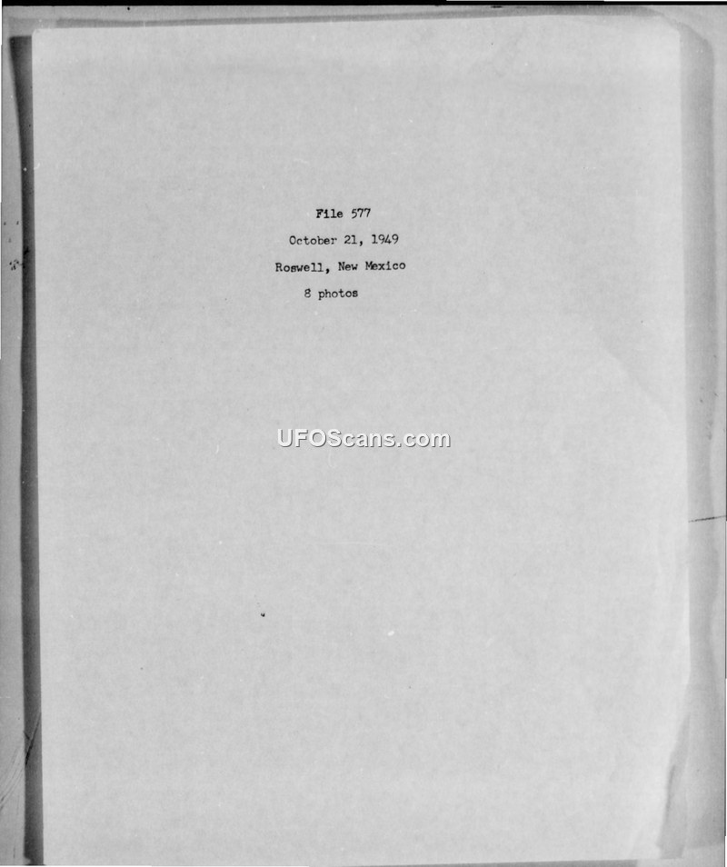 File 577 is a 1949 document from Roswell, New Mexico, containing eight unclassified photographs related to an unidentified aerial sighting. The document provides no narrative context or official explanation for the images.