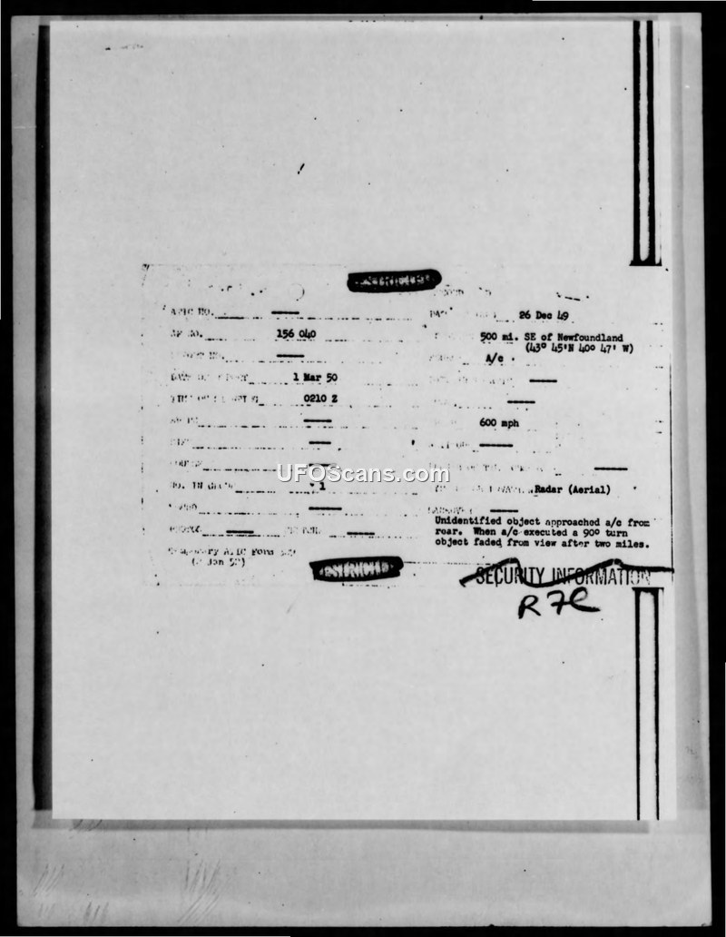 On December 26, 1949, an RB-29 aircraft detected an unidentified object on its APQ-13 radar while flying over the North Atlantic. The object approached at 600 mph but was not visually confirmed.