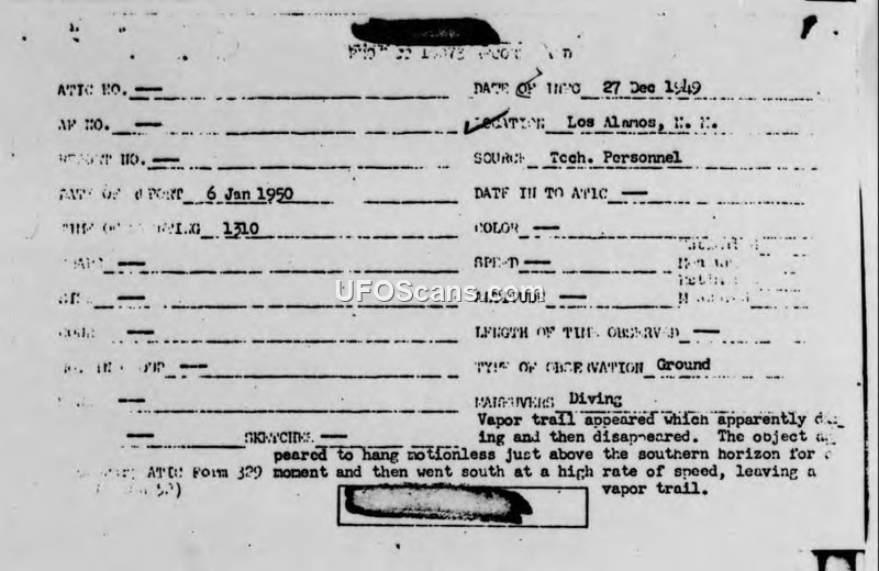 A series of sightings of an unidentified object over the Carolinas in December 1949 were investigated by the CIC. The objects were officially identified as vapor trails from an Air Force B-36 aircraft.