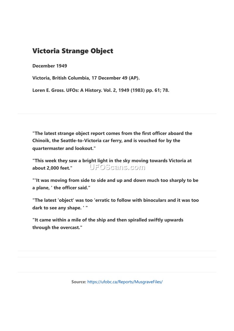 This document provides a brief account of a sighting of a strange object that occurred on December 17, 1949, near Victoria, British Columbia. The report originated from the first officer of the Chinoik, a Seattle-to-Victoria car ferry, and was corroborated by the ship's quartermaster and lookout. According to the account, the witnesses observed a bright light in the sky moving toward Victoria at an altitude of approximately 2,000 feet. The officer described the object's movements as being too sharp and erratic to be an aircraft, noting that it moved from side to side and up and down. The object approached within a mile of the ferry before spiraling swiftly upward through the overcast sky. The witnesses were unable to discern any specific shape due to the darkness, and the object's erratic behavior made it difficult to track with binoculars. The information is cited from Loren E. Gross's work, 'UFOs: A History, Vol. 2, 1949'.