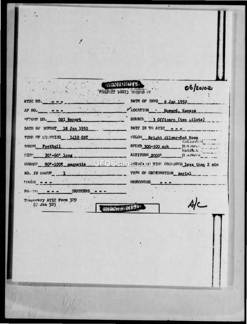 Three experienced pilots reported a football-shaped, silver object near Howard, Kansas, on January 6, 1950. OSI investigation found no evidence of balloons, flares, or other conventional explanations, and the case was subsequently closed.
