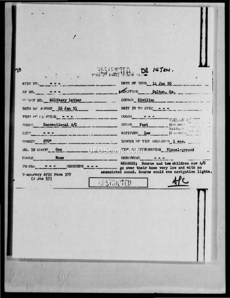 A civilian in Dalton, Georgia, reported a silent, low-flying object with navigation lights on January 14, 1950. The report was forwarded to Wright-Patterson AFB for investigation under Operation Grudge.