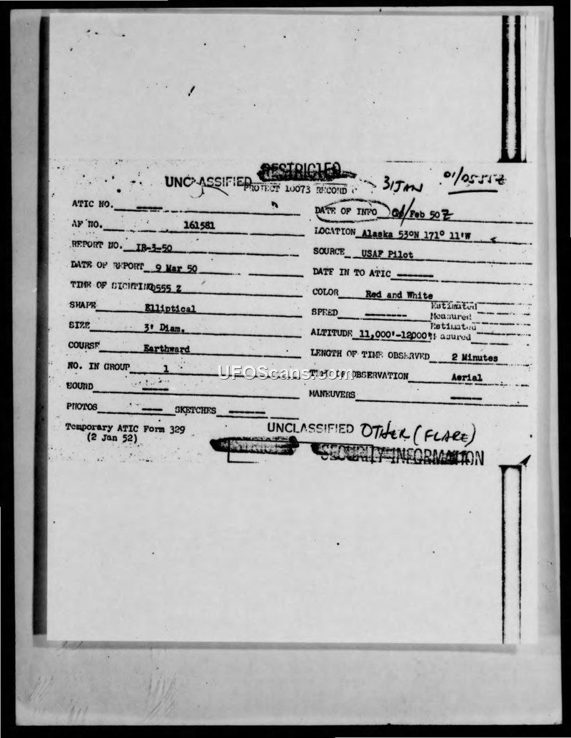 This document is a compilation of investigative reports by the United States Air Force Office of Special Investigations (OSI) regarding a series of sensational claims about crashed 'flying saucers' and their extraterrestrial occupants. The investigation was triggered by an article in the 'Wyandotte Echo' on January 6, 1950, which quoted a Kansas City auto dealer claiming to have met an engineer in Denver who had visited a secret radar installation near the New Mexico-Arizona border. This engineer allegedly witnessed two crashed saucers, recovered parts from them, and claimed the occupants were three-foot-tall, blond, beardless beings from Venus. The OSI conducted extensive interviews with the individuals involved, including the auto dealer and various associates. The investigation consistently found that these claims were fabrications. Agents discovered that the 'engineer' was not a credible source, and that the 'parts' he claimed to possess were mundane items, such as electrical components. Furthermore, inquiries into the alleged radar installation and the 'United States Research Bureau' in Los Angeles yielded no results, confirming these entities did not exist. The reports document the systematic debunking of these claims, with investigators noting that the primary subjects were unreliable and, in some cases, considered to be mentally unstable. The investigation concluded that the entire story was false, and the case was closed by the 13th District Office of Special Investigations. Additionally, the file includes a separate, unrelated sighting report from an Alaskan flight crew who observed a red and white 'flare' in the sky, which was also investigated and attributed to a flare or meteor. The document serves as a record of the military's efforts to address and dismiss public hysteria and misinformation regarding UAPs during the early Cold War period.