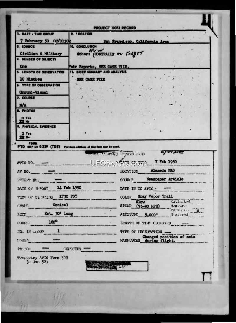 A 1950 sighting report from the San Francisco area describes a conical object with a vapor trail. ATIC concluded the object was likely a contrail or a target.