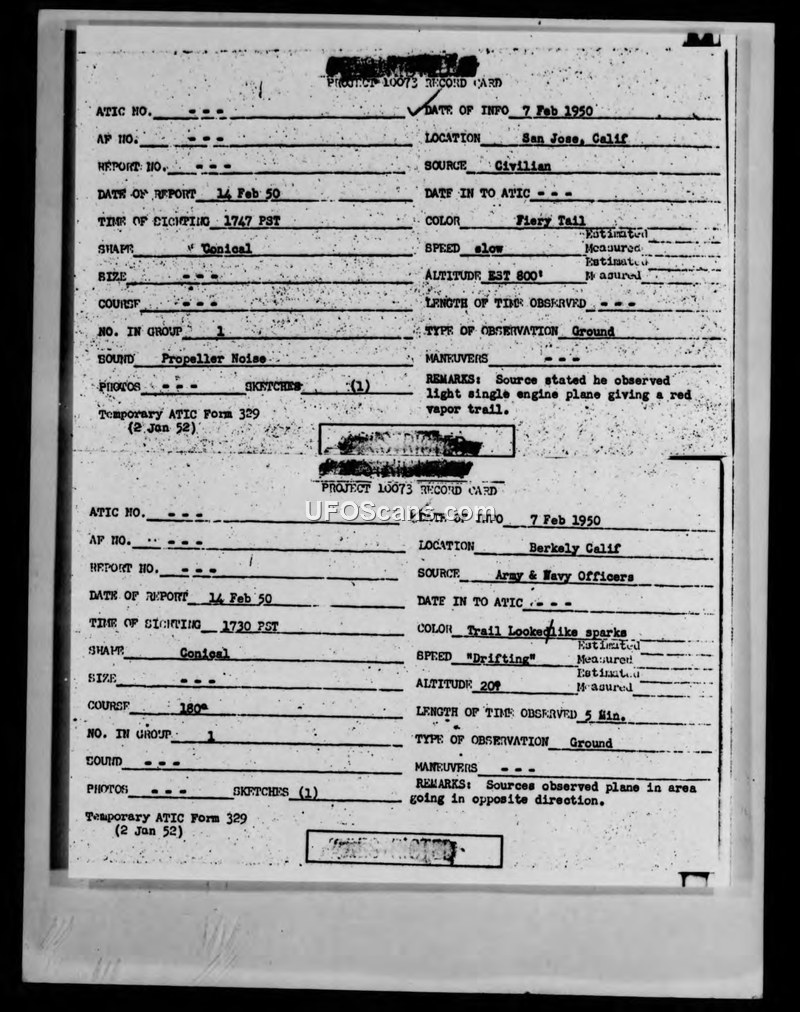 Multiple witnesses in the San Francisco Bay Area reported a conical, silver object with a vapor trail on February 7, 1950. The military investigated the reports but reached no definitive conclusion regarding the object's identity.