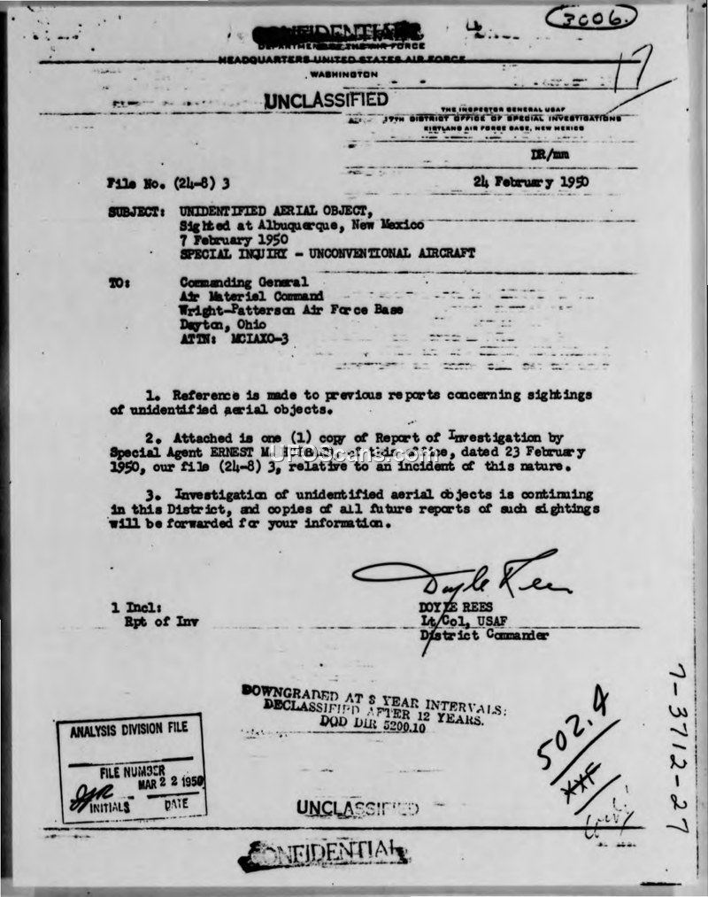 UNIDENTIFIED AERIAL OBJECT, Sighted at Albuquerque, New Mexico 7 February 1950