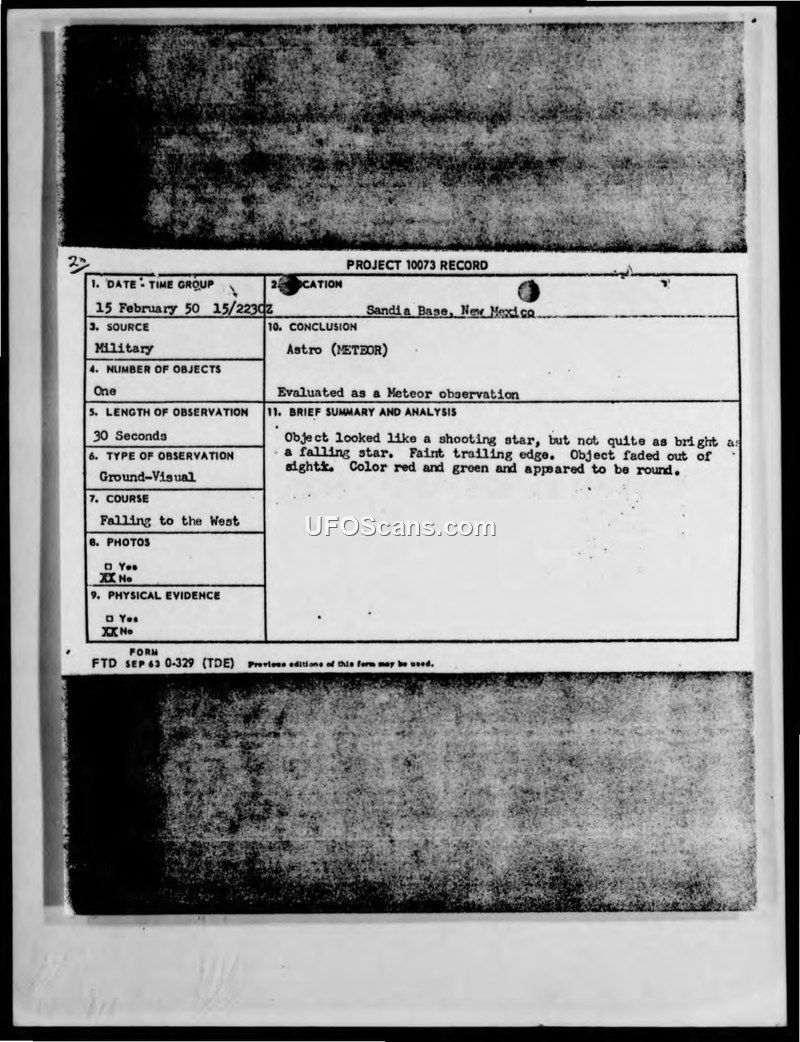 This report details a 15 February 1950 sighting of a round, red and green object at Sandia Base, New Mexico, by Cpl Robert C. J. Burhans. The Air Force Office of Special Investigations concluded the object was a meteor.