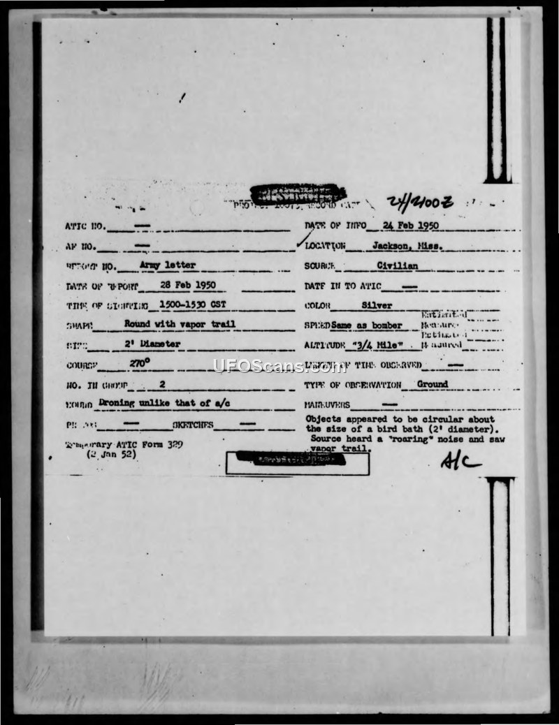 A Jackson, Mississippi housewife reported two silver, circular objects on February 24, 1950. Military authorities investigated the report and confirmed with the U.S. Weather Bureau that the objects were not weather balloons.