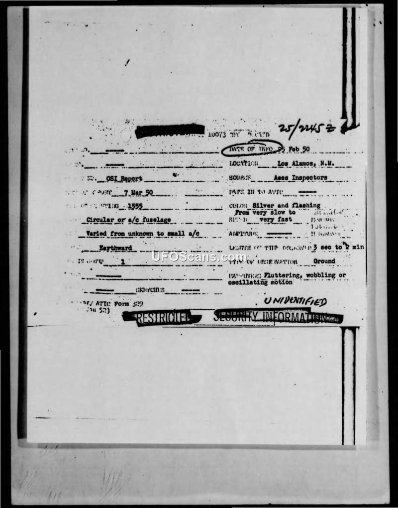 This report documents a 1950 sighting of an unidentified aerial object by Atomic Energy Security Service inspectors at Los Alamos, New Mexico. The object was described as a silver, flashing, circular or fuselage-shaped craft capable of rapid speed changes and oscillating flight.