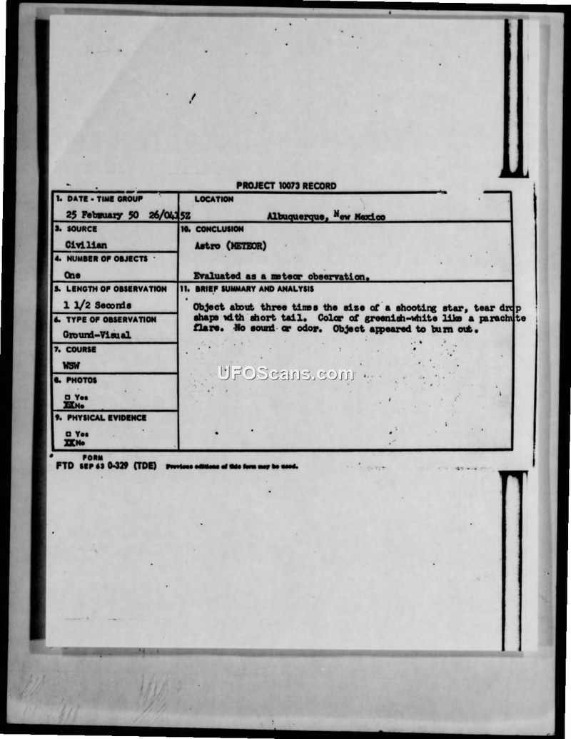 A report from the 17th District Office of Special Investigations regarding a 25 February 1950 sighting of a fireball in Albuquerque, New Mexico. The object was officially identified as a meteor.