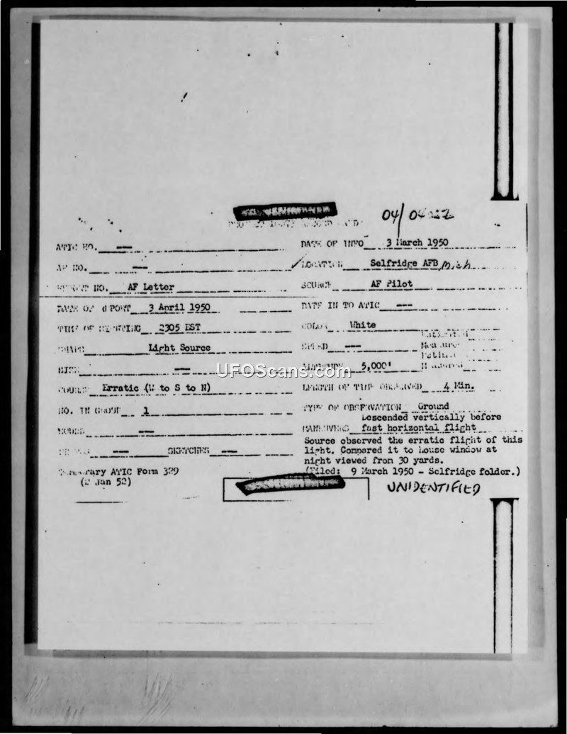 Unidentified Flying Object - Selfridge AFB, Michigan - March 1950