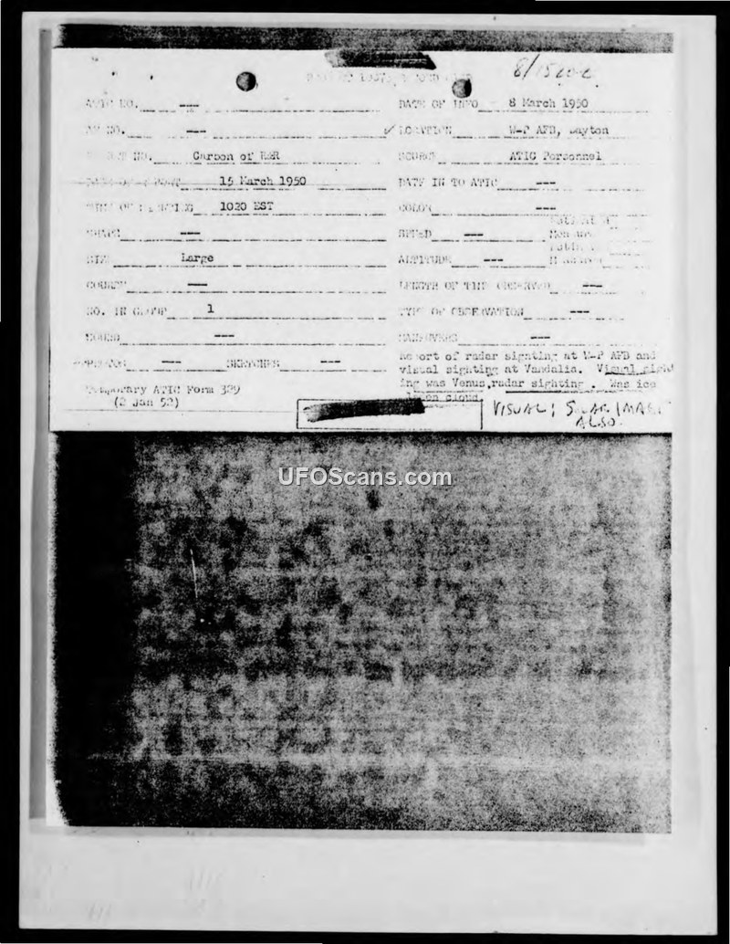 On 8 March 1950, multiple witnesses and radar systems near Wright-Patterson AFB reported an unidentified object. Official investigations concluded the sightings were caused by the planet Venus and radar reflections from ice-laden clouds.
