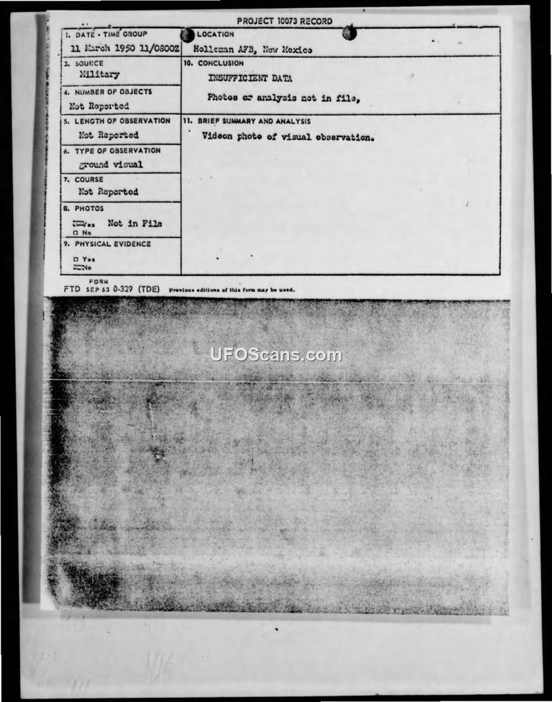 This document serves as a record for Project 10073, detailing investigative efforts regarding aerial phenomena in New Mexico during early 1950. Following a high frequency of reports in the vicinity of Vaughn, New Mexico, a team of military personnel and researchers conducted interviews and site assessments to determine the feasibility of establishing a continuous monitoring program. The proposed program included the use of Askania instrument triangulation, spectrum grating on Mitchell cameras, and frequency spectrum analysis equipment provided by the Signal Corps Engineering Laboratory. Coordination for these efforts involved multiple entities, including Cambridge Research Laboratories, the University of New Mexico, and Headquarters, Air Materiel Command (AMC). The document notes that a contract with Land-Air, Inc. was increased by $20,000 to maintain constant watch at two Askania stations near Vaughn for a six-month period. Additionally, the record highlights a specific event on 11 March 1950, where Major Daynor observed and photographed phenomena at Holloman Air Force Base. Despite these efforts, the official conclusion for the specific record entry remains 'INSUFFICIENT DATA,' with a note indicating that the relevant photographs or analysis were not contained within the file.