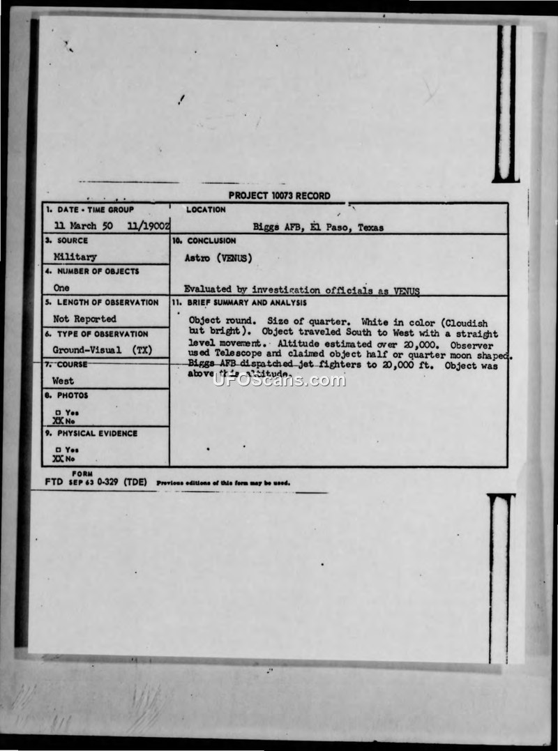 Project 10073 Record: Sighting at Biggs AFB, 11 March 1950