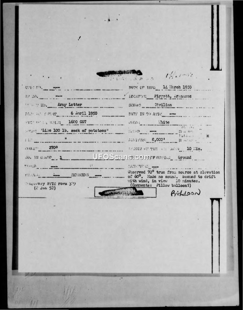 A reliable witness in Piggott, Arkansas, reported a white, potato-shaped object drifting at 8,000 feet on March 14, 1950. The military investigated the report, noting the witness's high credibility and suggesting the object might have been a weather balloon.