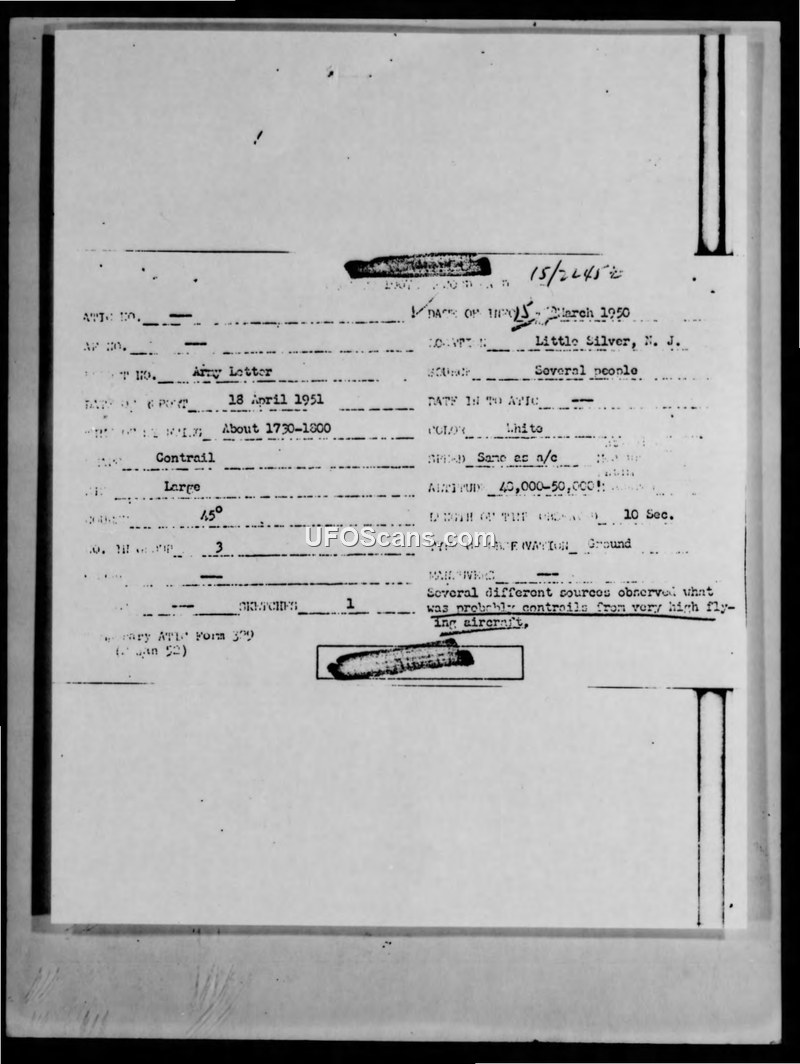 This document contains four intelligence reports from March 1950 detailing multiple witness accounts of three high-altitude, silent, fast-moving objects leaving vapor trails over New Jersey. The reports were submitted by Fort Monmouth intelligence officers to the Air Materiel Command for further evaluation.