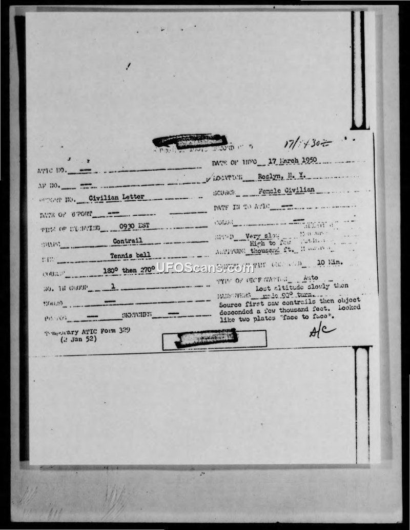 On March 17, 1950, at approximately 0930 EST, a female civilian driving from Northport to New York City observed an unusual aerial object between the towns of East Norwich and Roslyn, Long Island. The witness initially noticed a smoke or vapor trail at an extremely high altitude, which she first mistook for sky-writing. As she watched, the object dropped away from the trail and began a slow descent. At this stage, the object appeared to be the size and shape of a tennis ball. The witness stopped her vehicle to observe the craft more closely as it moved from a northerly to a southerly direction. As the object approached, its appearance became more distinct, and the witness described it as two plates placed face to face. She noted that the length of the object appeared slightly wider than its width. After this period of descent, the craft changed direction and proceeded due west, disappearing from sight without any further significant change in altitude. The total duration of the observation was approximately ten minutes, and the minimum altitude was estimated to be several thousand feet. The witness, who stated that her husband is an aeronautical engineer, asserted that she had been exposed to aircraft identification and was convinced the object was not a conventional jet, propeller-driven aircraft, balloon, or parachute. She further noted that she had not reported the incident to any news agencies or local newspapers, choosing instead to forward the description directly to the authorities at Project Saucer at Wright-Patterson Field.