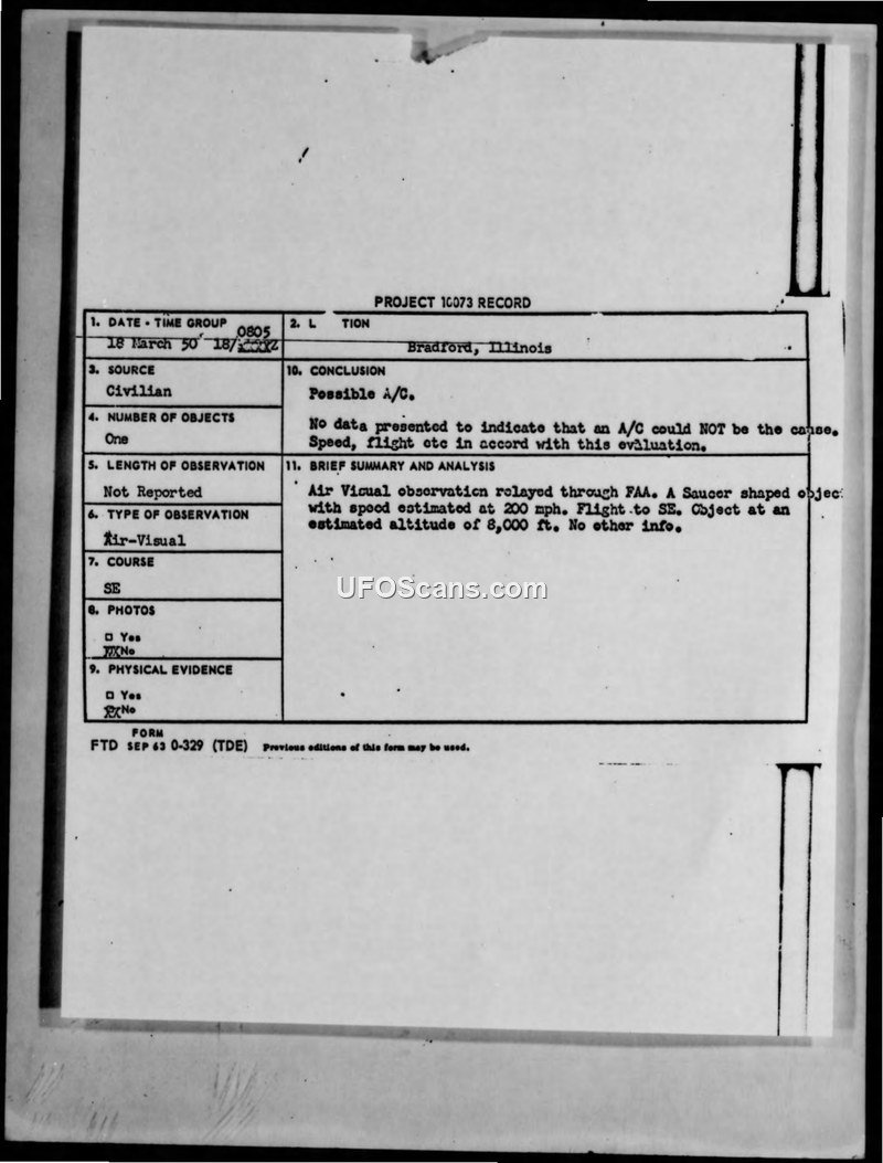 An unidentified saucer-shaped object was reported by a civilian pilot over Bradford, Illinois, on 18 March 1950. Intelligence officials concluded the object was a possible aircraft, as the reported flight characteristics were consistent with conventional flight.