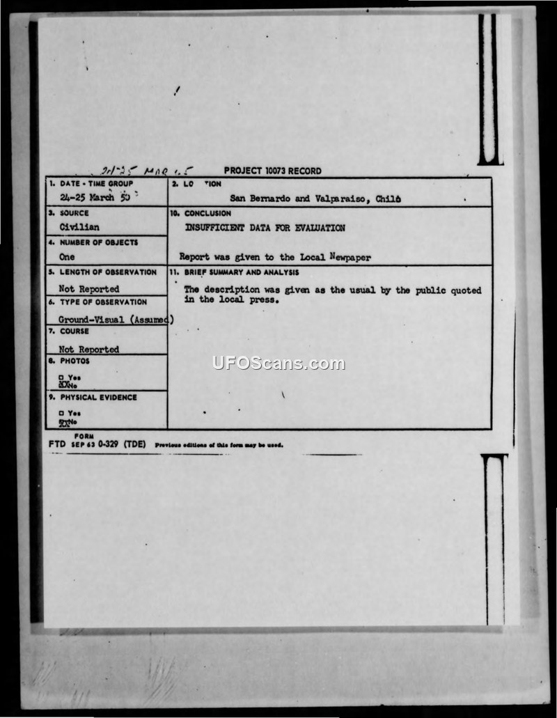 This report, dated 30 March 1950, documents a series of 'flying disc' sightings across Chile during March 1950. The first incident occurred on 11 March in Punta Arenas, where inhabitants reported a silver, ping-pong ball-shaped object traveling southwest at extreme altitude. Professor Frederico Rutland, Director of the Observatorio Astronomico of the University of Chile, publicly stated that these sightings were likely the planet Venus, which was clearly visible at that time. A second series of sightings occurred in the Santiago, San Bernardo, and Valparaiso areas on 24 and 25 March. A third, more detailed sighting took place on 28 March over Santiago, where a large crowd observed an object moving at high speed and altitude. M/Sgt. Patterson, an Air Attache office employee, personally witnessed this event. However, on 29 March, Patterson observed a silver, stationary object in the same relative position and concluded, following careful observation, that the object was the planet Venus rather than a flying disc. Professor Rutland reiterated his assessment that the objects were Venus. The report notes that local press in Chile had been actively headlining 'flying disc' dispatches from various countries, contributing to public interest in the phenomenon.