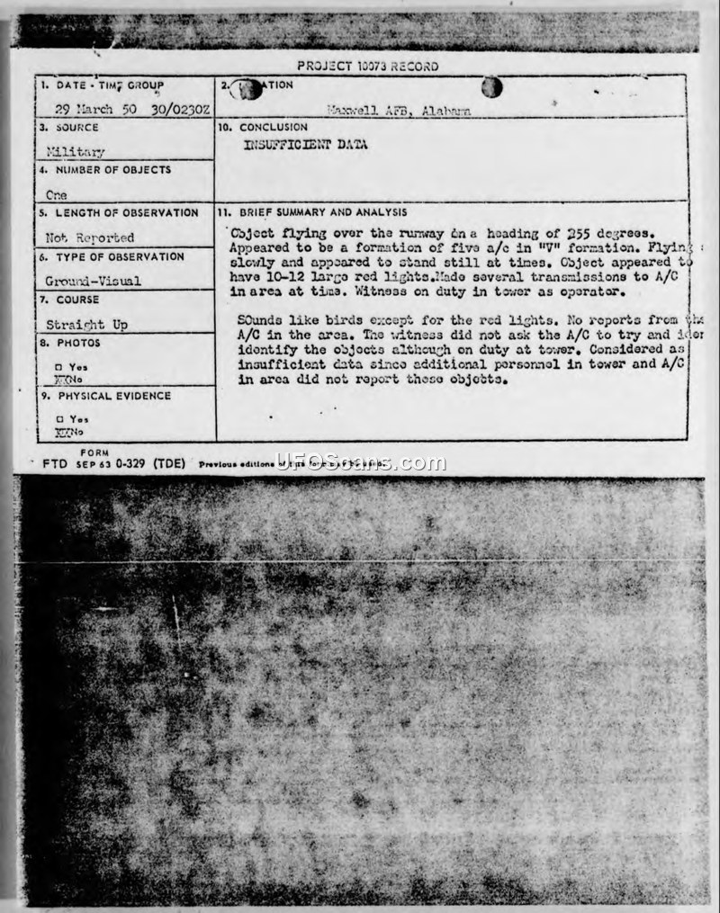 This report documents a March 1950 sighting of a V-formation of five objects with red lights over Maxwell AFB. The incident was officially classified as having insufficient data due to a lack of corroborating reports from other personnel.