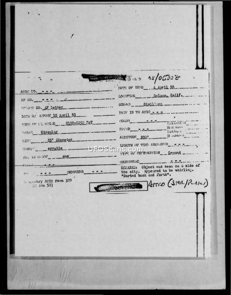 A report from Edwards AFB detailing a 4 April 1950 sighting of a circular, 25-foot object in Delano, California. The object exhibited erratic, whirling, and orbiting flight patterns over a nearly two-hour period.