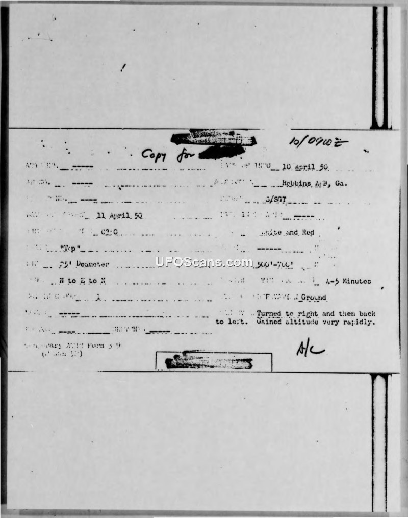 Spot Report of Unidentified Flying Object — Robins Air Force Base, 10 April 1950