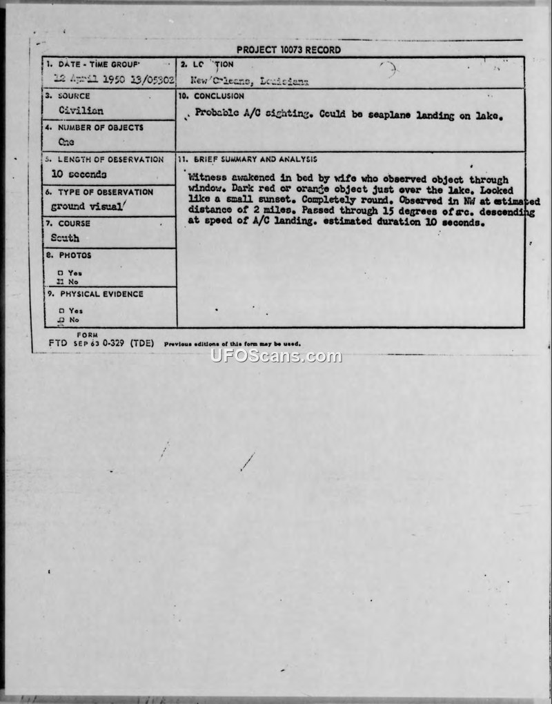 Project 10073 Record: Unidentified Aerial Object Sighting, New Orleans, Louisiana, 12 April 1950