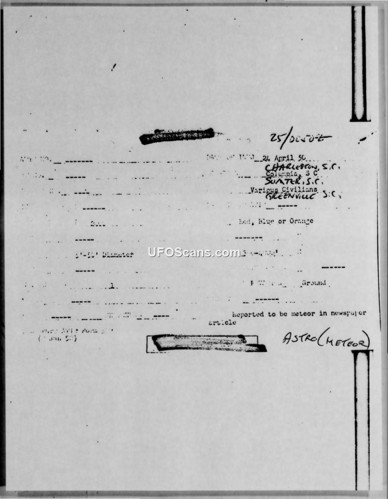 Military and civilian reports from April 1950 describe a large, red, cylindrical object with a trail of sparks observed over multiple cities in South Carolina. The military report from Shaw Air Force Base provides specific flight characteristics, including speed and altitude, while noting the absence of sound.