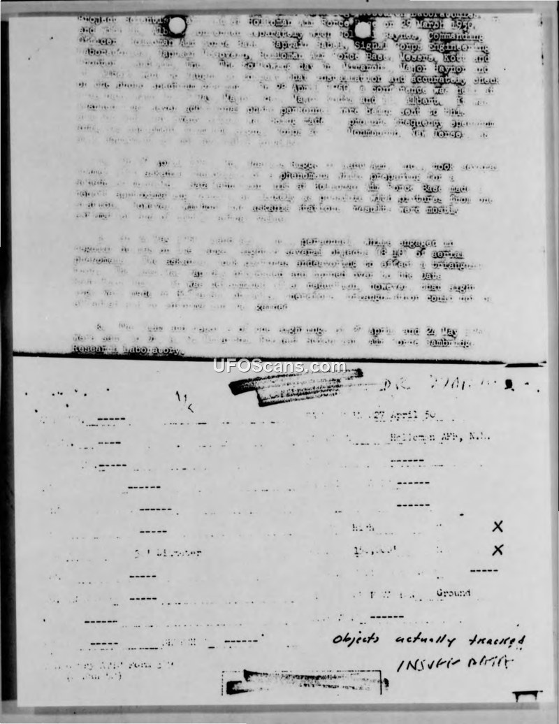 Analysis of film from 27 April 1950 indicated objects at 150,000 feet altitude, 30 feet in diameter, over the Holloman range, traveling at high speed. Triangulation for the 24 May 1950 sighting was not possible as the films captured two different objects.