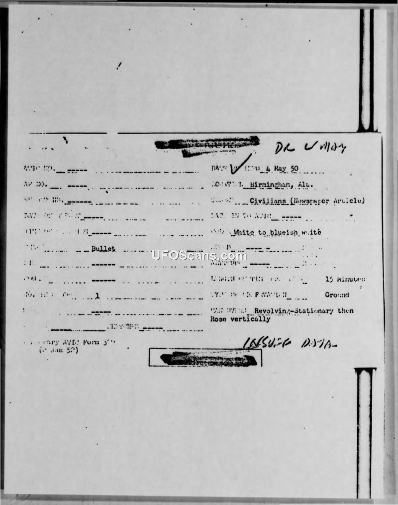 The report documents a sighting of an unidentified object over Birmingham, Alabama, on May 5, 1950, by seven witnesses. The object was described as bullet-shaped, white to bluish-white, and possessing a long fiery tail. It remained stationary for 15 minutes before rising vertically and disappearing.