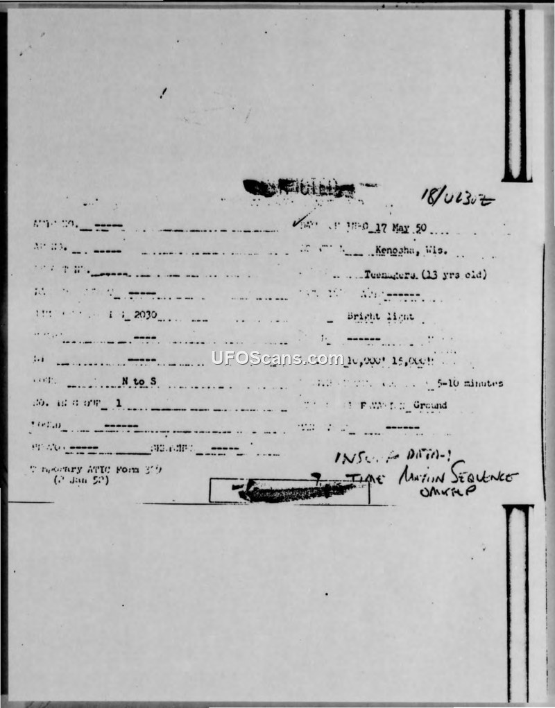 A 13-year-old witness reported a bright light moving in an arc over Kenosha, Wisconsin, on May 17, 1950. The report was filed with the Air Materiel Command but was marked as having insufficient data.