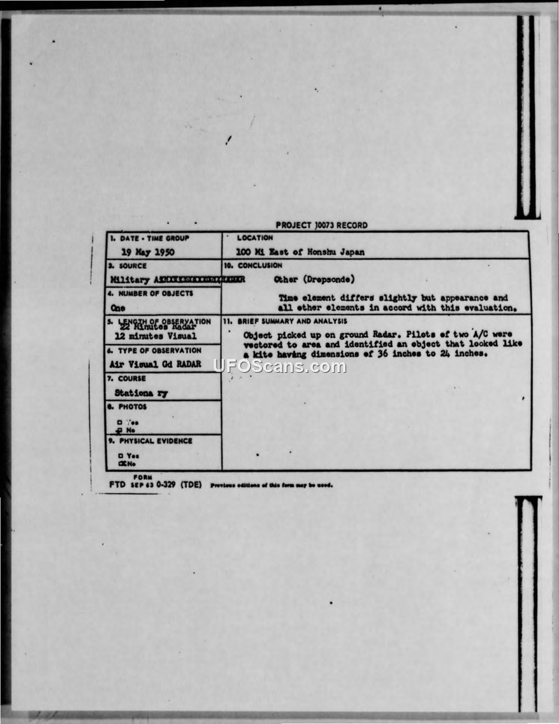 Project J0073 Record - Sighting of Unidentified Object, 19 May 1950
