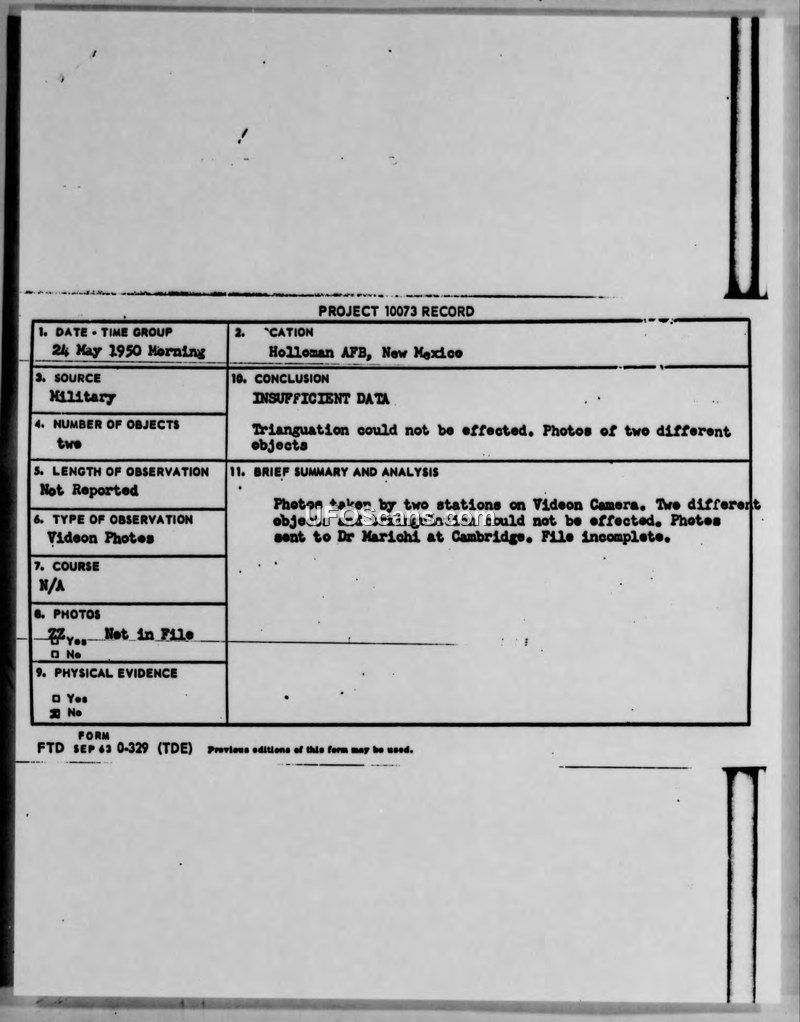 Holloman AFB personnel reported multiple aerial sightings in 1950, but technical analysis failed to triangulate the objects. A separate pilot report from May 1950 describes a cigar-shaped object, though radar confirmation was unsuccessful.