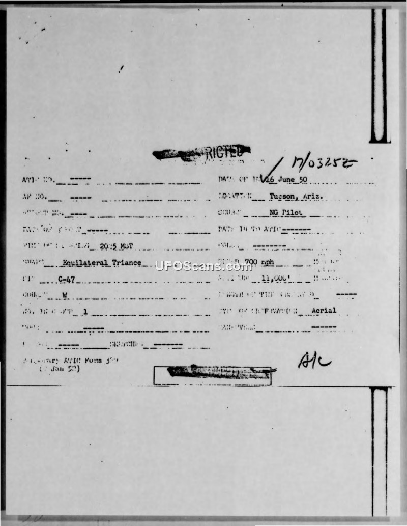 A 1950 military report detailing the sighting of an equilateral triangle-shaped object with perimeter lights by a C-47 pilot near Tucson, Arizona. The object was estimated to be traveling at 700 mph at 11,000 feet.