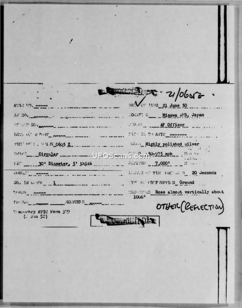 An Air Force officer at Misawa AFB, Japan, reported a 30-foot circular, silver object flying at 7,000 feet on 21 June 1950. The object exhibited high-speed vertical maneuvers and was observed for 20 seconds.