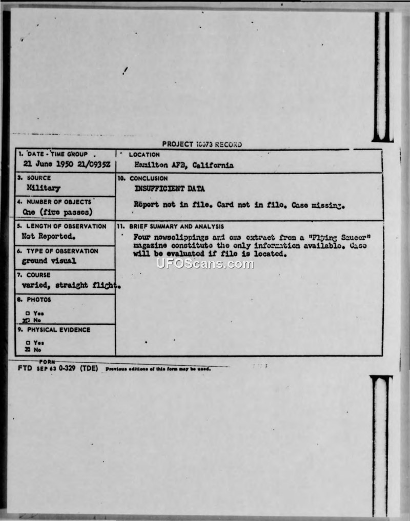 On June 21, 1950, at approximately 1:35 A.M., three Air Force personnel stationed at Hamilton Air Force Base in California reported observing an unidentified aerial object. The witnesses, Corporal Garland Pryor and Staff Sergeants Ellis R. Lorimer and Virgil Cappuro, described a disk-shaped object that performed five passes over the base at an estimated speed of 1,000 to 1,500 miles per hour and an altitude between 2,000 and 5,000 feet. The observers reported that the object emitted a blue-green streak of flame, which one witness likened to the flame of a blow torch, and produced a sound described as a 'thunder-like roar.' Despite the witnesses' experience in control tower operations, the military's official position at the time was that no planes were over Hamilton Field during the pre-dawn hours. The official Project 10073 record for this incident is marked as 'Insufficient Data' because the primary case file and index card are missing. The military's assessment relies entirely on secondary sources, specifically four news clippings and an extract from a 'Flying Saucer' magazine. The document notes that the case remains open for evaluation should the original file be recovered.