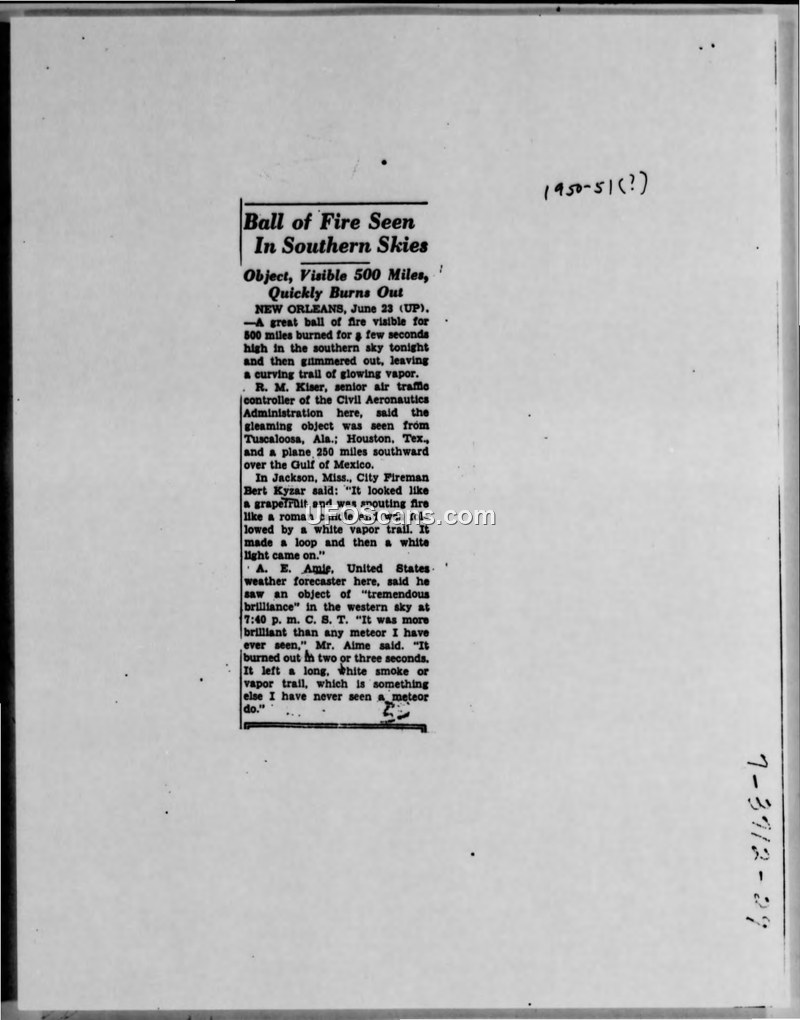 This document is a compilation of intelligence reports and newspaper clippings from late June 1950 concerning sightings of unconventional aerial objects across the United States, particularly in the Gulf of Mexico, Alabama, Kentucky, and California. The primary report, issued by the Oklahoma City Air Materiel Area on June 28, 1950, details a sighting by a 'Pelican' weather reconnaissance mission over the Gulf of Mexico on June 24, 1950. Crew members observed a huge ball of fire in a spiraling descent from at least 50,000 feet, leaving a bluish vapor trail that persisted for twenty minutes. The report includes radio fixes and visual bearings confirming the object's position. Other reports included in the file describe similar phenomena. A newspaper clipping from the Mobile Press Register details a sighting over Mobile, Alabama, where a pilot, Capt. James L. Hansen, reported a meteor-like object with a vapor trail. Another report from Louisville, Kentucky, mentions a WHAS-TV staff photographer, Al Hixenbaugh, who captured film of a bright disk-shaped object that appeared to stand motionless like a balloon before moving westward. A report from Redondo Beach, California, involves a United Airlines crew observing a cigar-shaped object flying at 14,000 feet, which maintained a parallel course for 20 miles before fading. The documents reflect a period of intense public and military interest in these phenomena, with various witnesses describing fiery balls, disks, and cigar-shaped objects. While some observers, such as weatherman Bill Tilson, suggested the Mobile sighting was a meteorite, the military reports maintain a formal, investigative tone, documenting the sightings through official channels for the Air Materiel Command at Wright-Patterson Air Force Base. The collection serves as a record of the diverse and widespread nature of these reports during the summer of 1950.