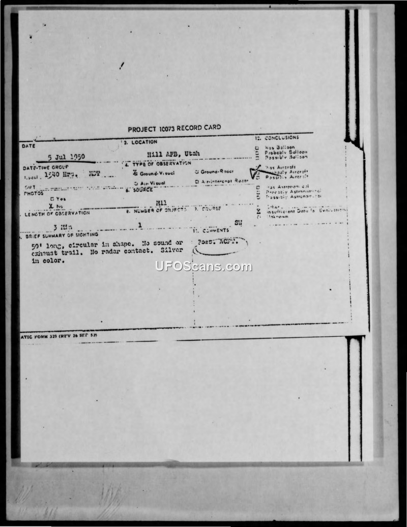 Project 10073 Record Card and Incoming Message — Hill AFB, Utah, 5 July 1950