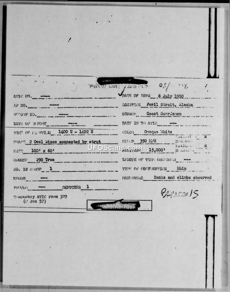 Report of Sighting of 'Flying Discs' or Other Phenomena in the Atmosphere — Peril Strait, Alaska, 8 July 1950
